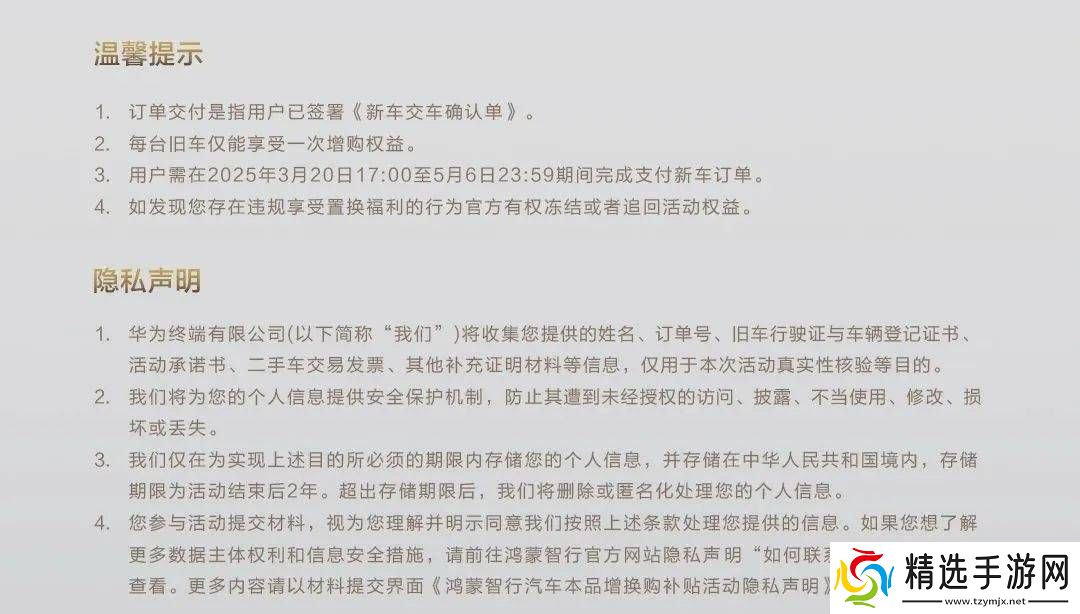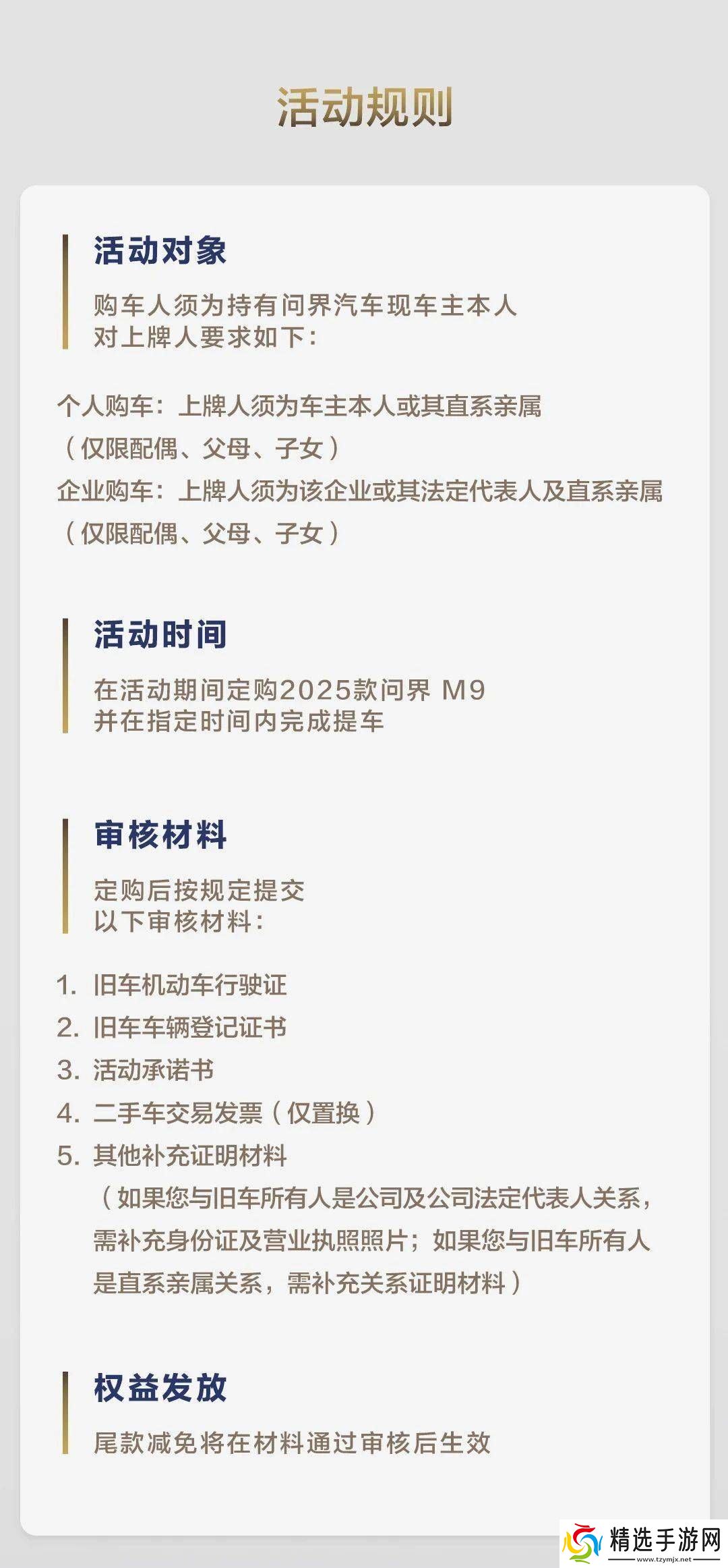 值得注意的是,本次活动有着明确的规则和要求。购车人必须是持有问界汽车的现车主本人,且对上牌人也有具体规定。个人购车时,上牌人需为车主本人或其直系亲属(包括配偶、父母、子女)。而企业购车时,上牌人则须为该企业或其法定代表人及直系亲属。购车人还需在活动期间定购2025款问界M9,并在指定时间内完成提车。