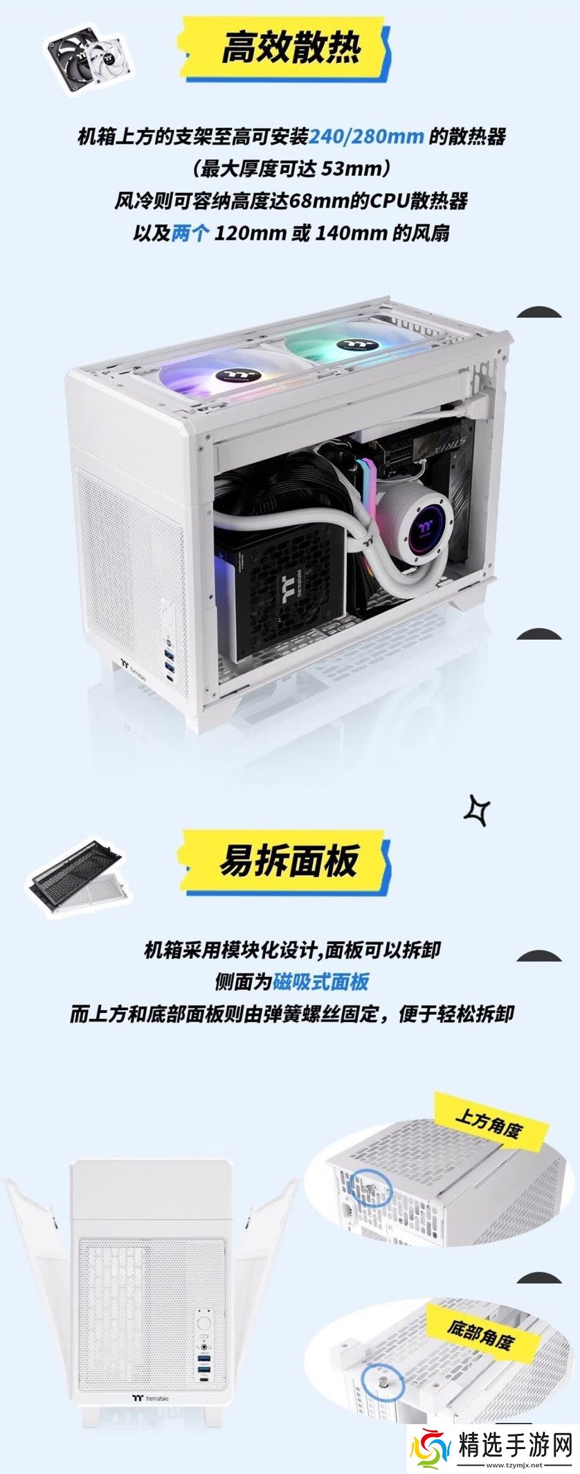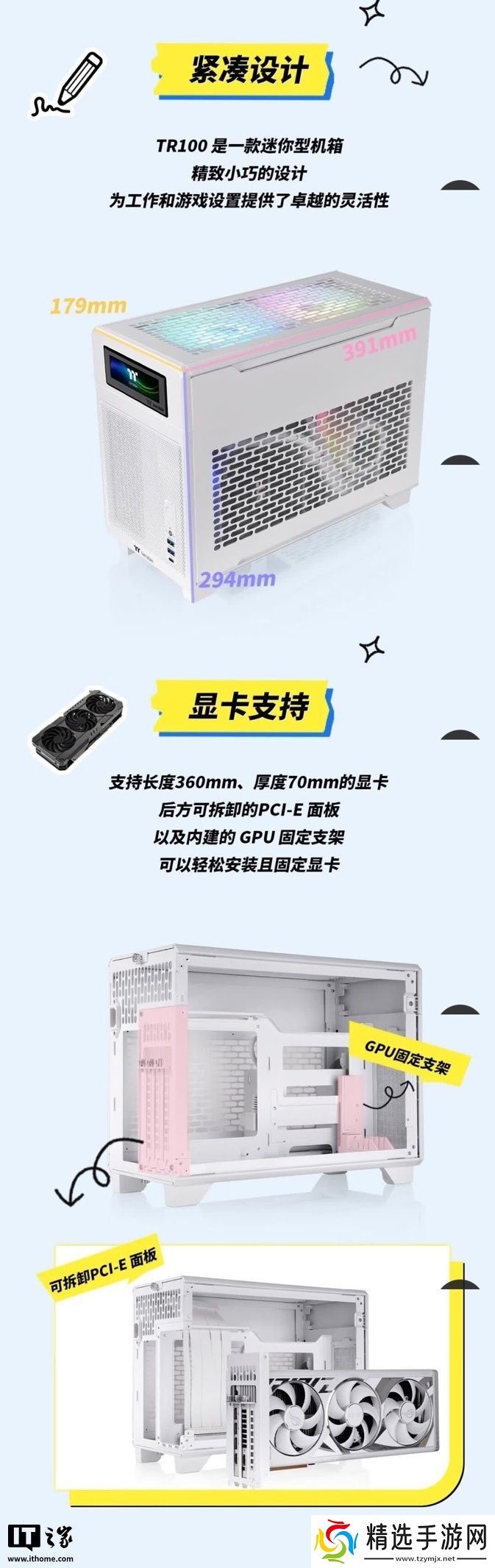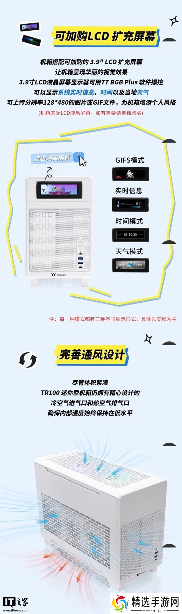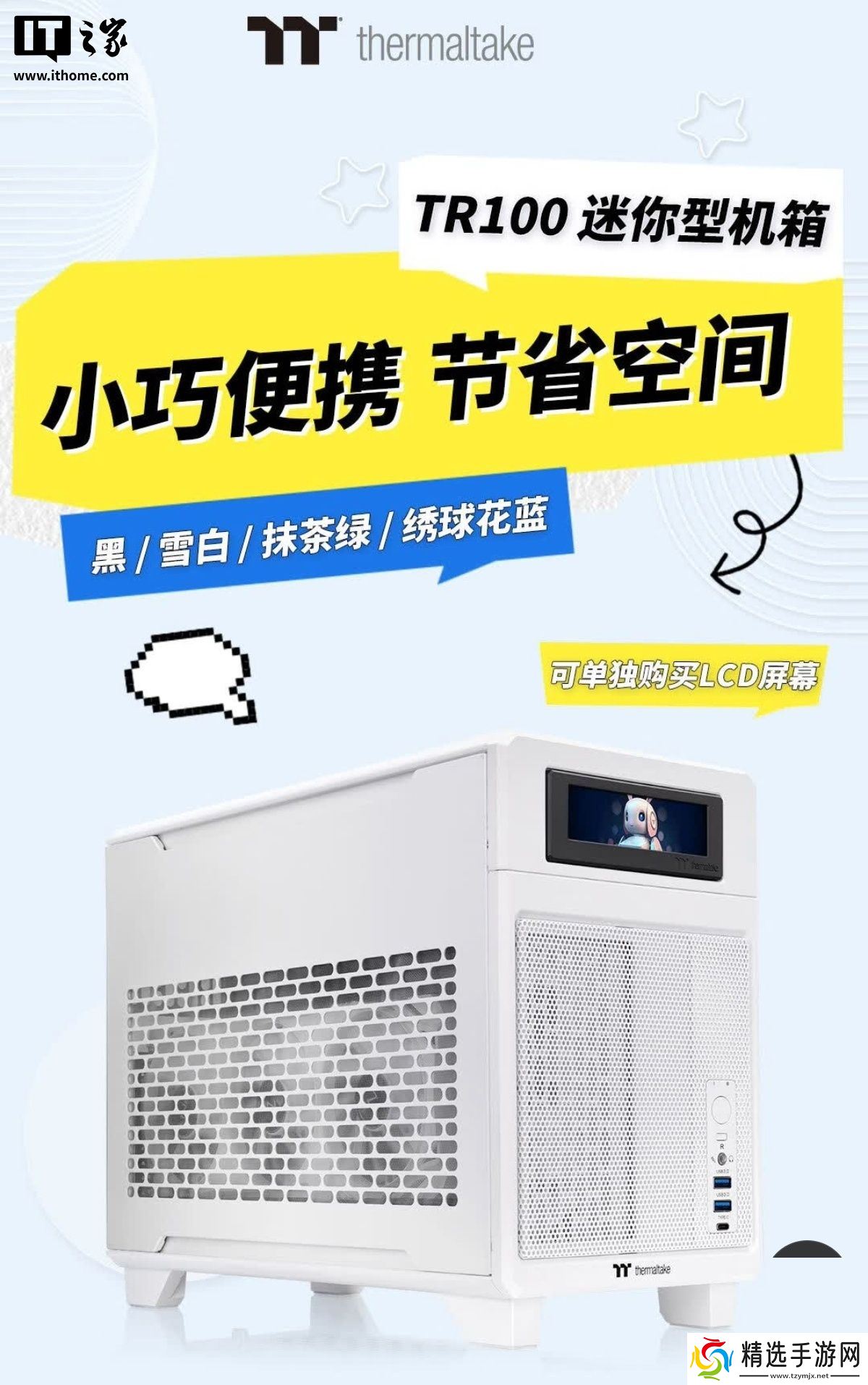 本站 3 月 20 日消息,在今年 1 月初的 CES 2025 展会上,Thermaltake(曜越)推出了 SFF 规格的 TR100 迷你机箱,提供黑色、雪白色、抹茶绿及绣球花篮四种颜色,可单独选配 LCD 屏幕。目前该机箱已登陆各大电商平台,四色的定价均为 719 元。