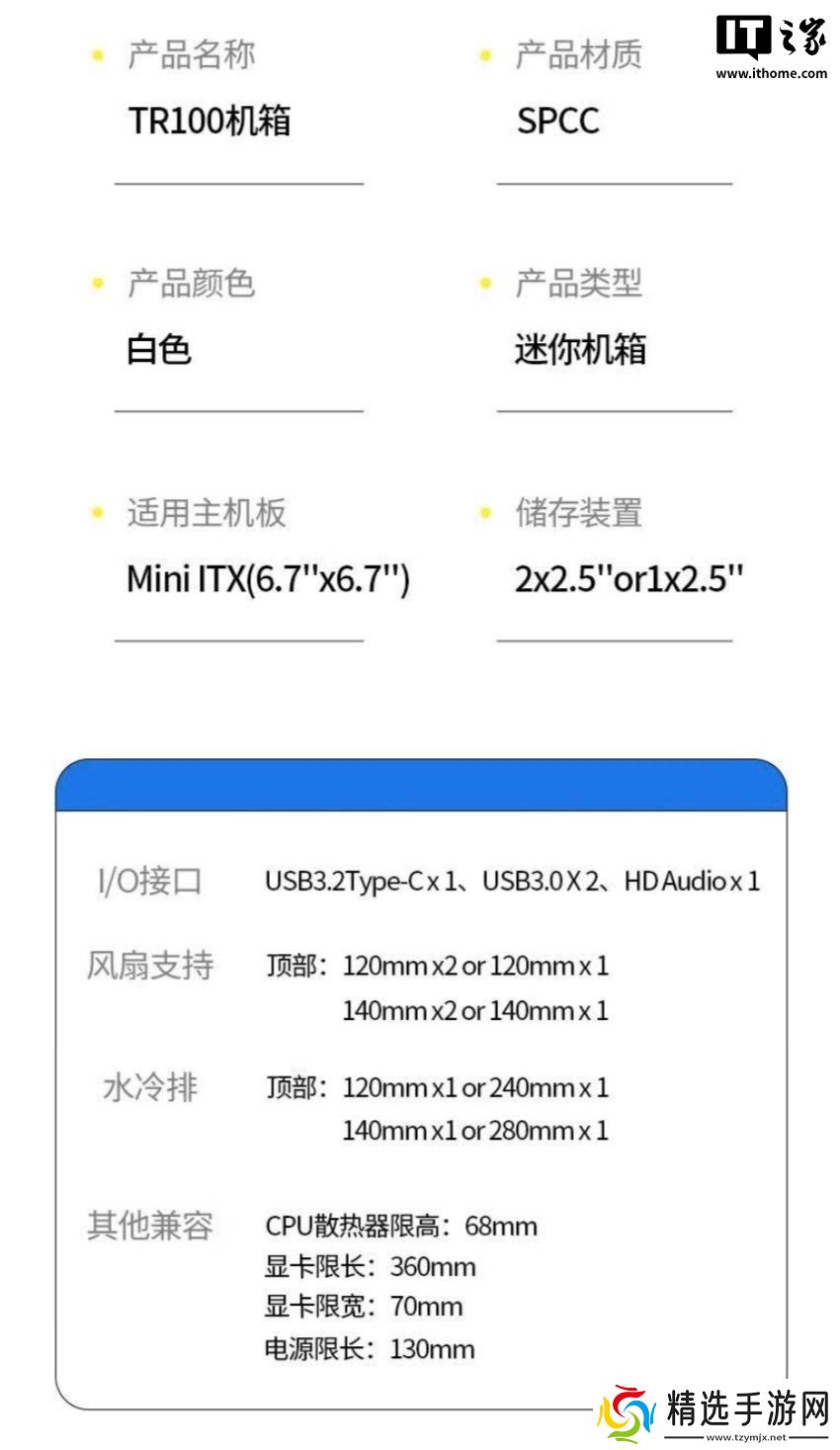 京东曜越 TR100 SFF 迷你机箱券后 719 元领 10 元券TR100 机箱为双舱式 Mini-ITX 设计,支持长度 360mm、厚度 70mm 的显卡。机箱上方可容纳两个 120mm 或 140mm 风扇,并最大支持安装 280mm 的一体式水冷。支持 SFX 和 SFX-L 电源。机箱正面有一个 USB 3.2 Type-C 接口、两个 USB 3.0 接口以及一个耳机接口。