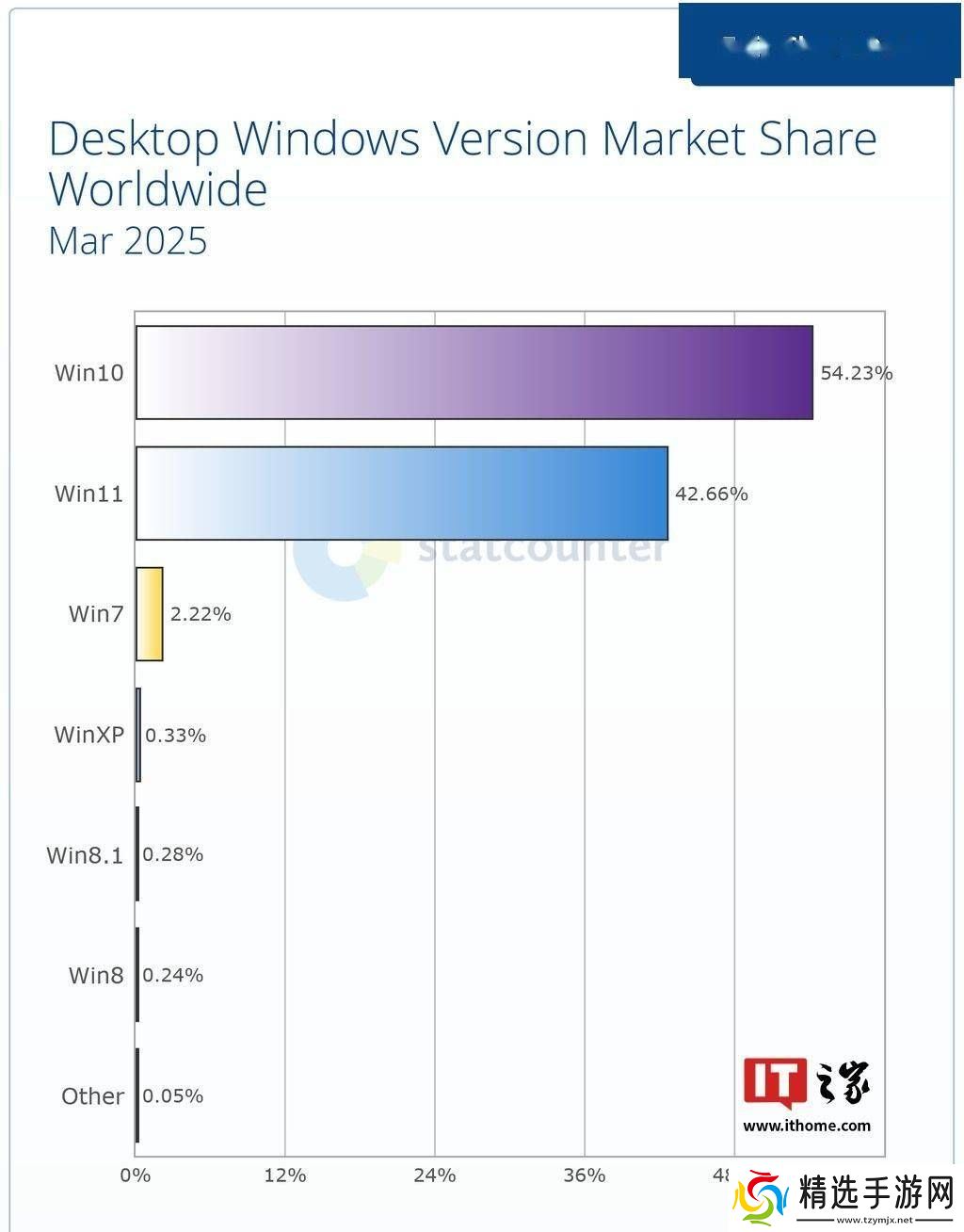 近期,市场调查机构Statcounter发布了关于Windows操作系统版本分布的最新数据,揭示了截至2025年3月的用户偏好趋势。数据显示,Windows 10依然保持着领先地位,占据了54.23%的市场份额,而Windows 11则紧随其后,占比达到了42.66%。这一变化表明,Windows 11与Windows 10之间的市场占比差距正在显著缩小,从2月的20.83个百分点缩减至11.57个百分点。
