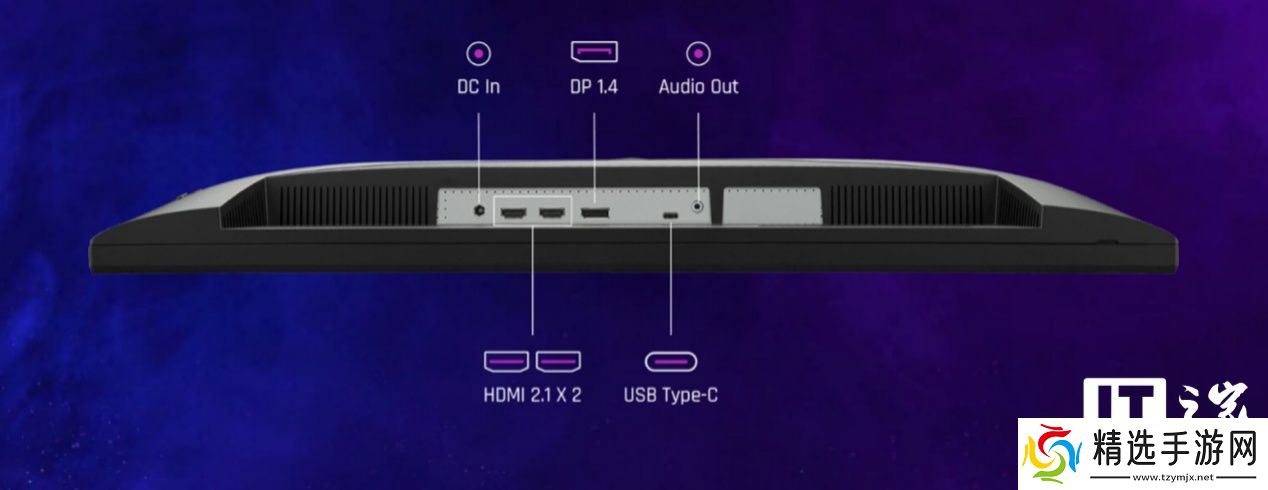 该显示器在 IO 接口方面,有一个 DC 电源接口、两个 HDMI2.1 接口、一个 DisplayPort 1.4 接口、一个 USB Type-C 接口,以及一个音频输出接口。Type-C 接口最大可提供 65W 的反向电源输出。