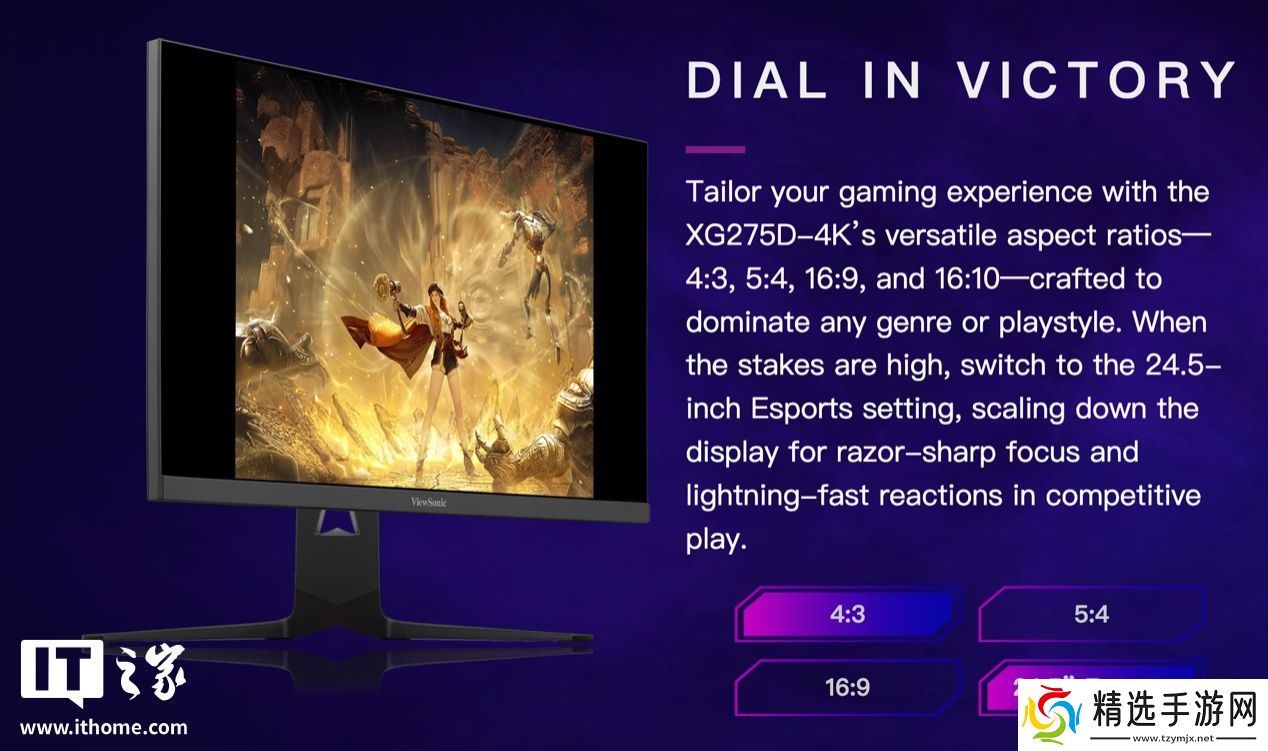 为照顾不同玩家需求,该显示器提供 4:3、5:4、16:9 及 24.5 寸电竞比例。机身背面可兼容 VESA 壁挂支架。官方称该显示器经过 macOS 测试,并能与 Xbox 及 PS5 兼容,为不同生态玩家提供良好的使用体验。