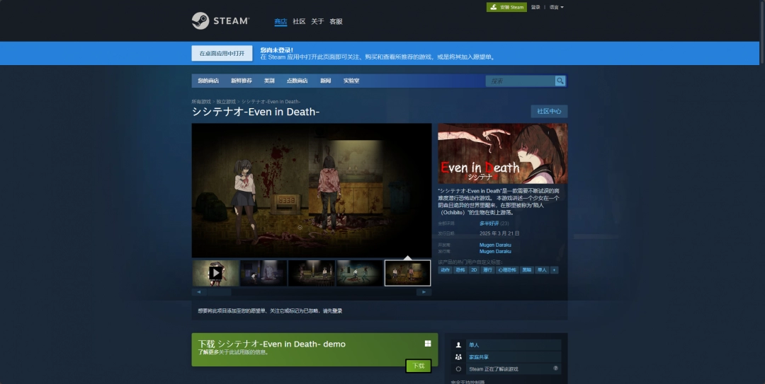 《Even in Death》是由日本独立工作室Mugen Daraku开发的高难度潜行恐怖动作游戏,而这款游戏的官网地址就是Steam平台的购买页面,进入到这个游戏的购买页面基本上就能知道所有这款游戏的信息。