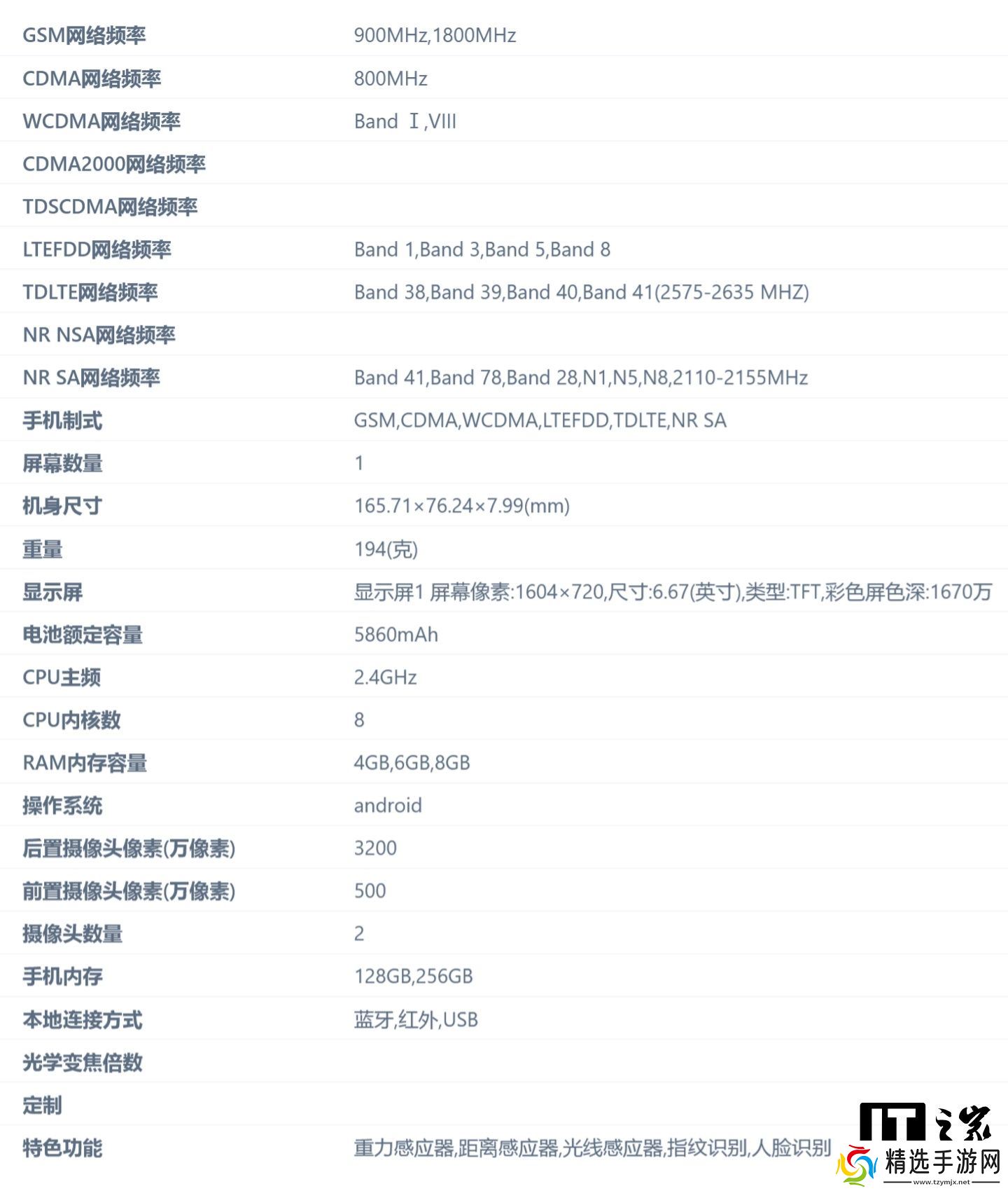 该机配备 6.67 英寸 TFT LCD 屏幕,分辨率为 1604 x 720 像素,支持 1670 万色。其他规格包括 5860mAh 电池、2.4GHz 八核处理器、4GB / 6GB / 8GB RAM、128GB / 256GB 存储、32MP 主摄、5MP 自拍摄像头、红外传感器、USB 接口以及侧边指纹识别。