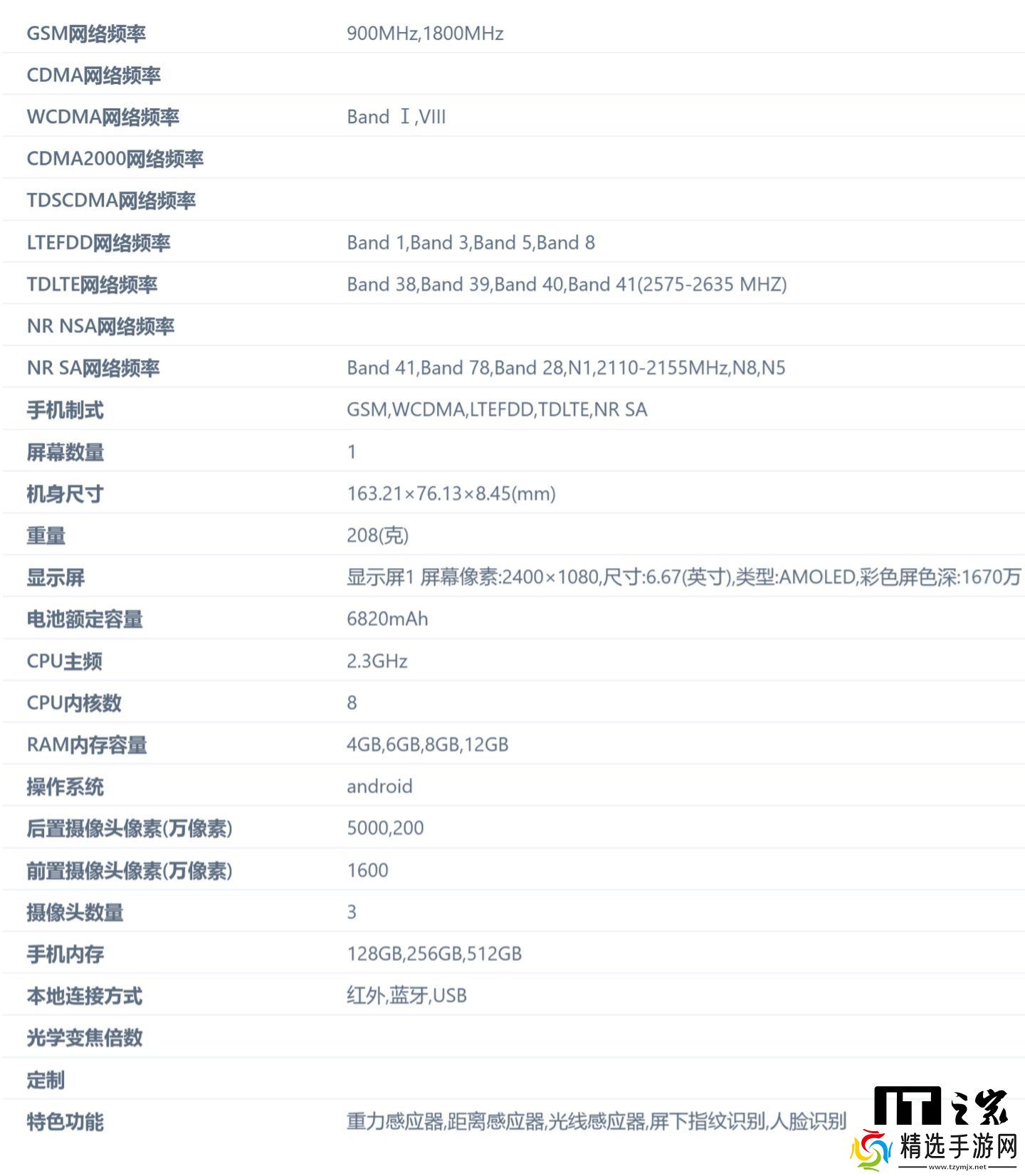 其他规格包括 6820mAh 电池、2.3GHz 八核处理器、4GB / 6GB / 8GB / 12GB RAM、128GB / 256GB / 512GB 存储、50MP + 2MP 双摄、16MP 自拍摄像头、红外传感器、蓝牙、USB 接口以及屏下指纹识别。