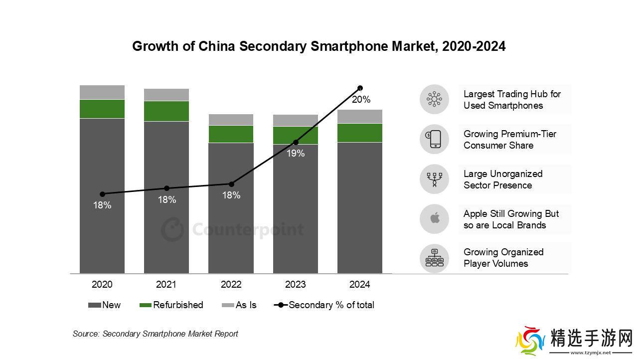 本站 3 月 25 日消息,中国作为全球最大的二手智能手机市场,其行业动态备受关注。市场调查机构 CounterPoint Research 昨日(3 月 24 日)发布博文,报告称 2024 年中国二手智能手机市场(包括翻新和二手手机)已占全国智能手机总销量的 20%。