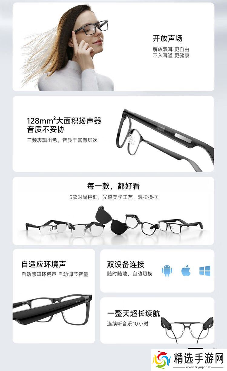功能方面,初代 MIJIA智能音频眼镜采用开放声场技术,支持360°乐音环绕,配备128mm²超动态平衡扬声器以及SBS2.0双悬挂平衡结构。此外,该产品还搭载双麦波束AI通话降噪算法,支持智能增强通话、双设备连接(可任意切换),具备IP54级防水。其待机续航可超过1周,日常续航“超22小时”,连续听音乐续航为10小时。