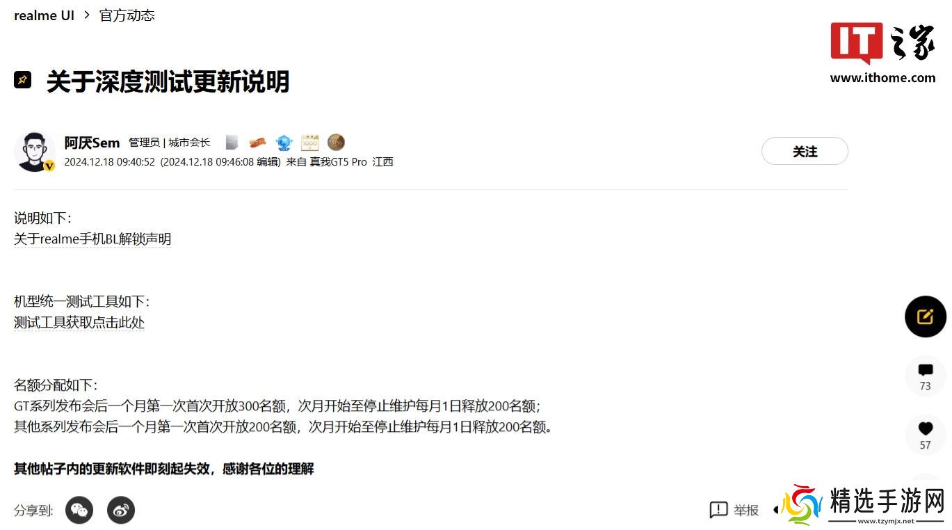据本站此前报道,真我社区管理员@阿厌Sem 今年 1 月发布了《关于深度测试更新说明》,就真我手机 BL 解锁情况进行说明。其中提到了真我手机 BL 解锁的名额分配情况: