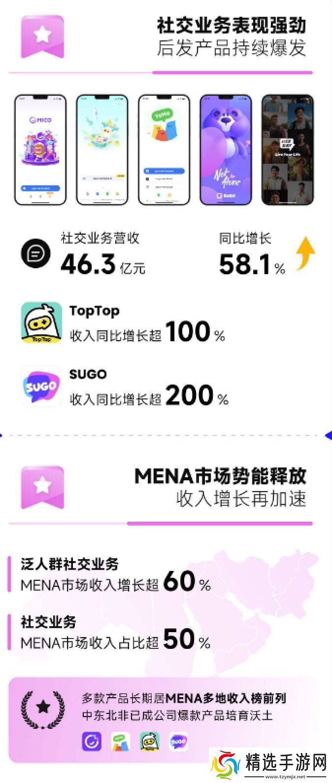 在业务构成方面,社交业务作为公司的核心,收入达到了46.3亿元,同比增长58.1%。其中,后起之秀TopTop和SUGO在中东和北非市场表现尤为抢眼。与此同时,公司的创新业务也取得了不俗的成绩,收入达到4.6亿元,同比增长21.3%。