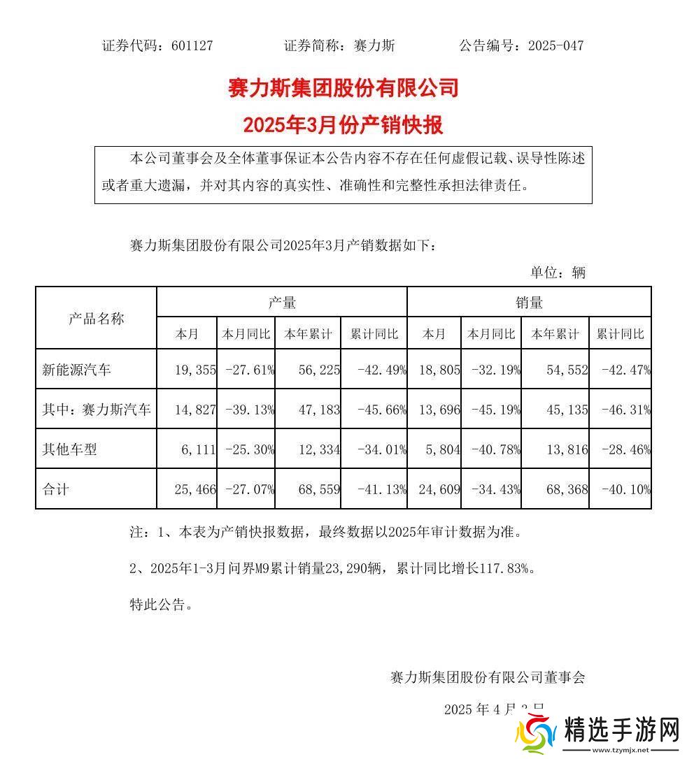 尽管整体销量和产量有所下滑,但赛力斯旗下的问界M9车型却表现出色。官方公告显示,问界M9在2025年前三个月的累计销量为23290辆,实现了117.83%的同比增长,这一成绩无疑为赛力斯集团注入了一剂强心针。