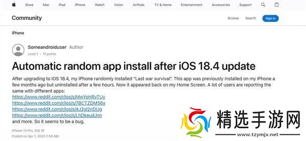 多位用户在苹果社区和各大社交平台上报告了一个奇怪的现象:在将iPhone升级至iOS 18.4后,他们发现之前已经卸载的应用程序竟然“死而复生”,重新出现在手机屏幕上。一位用户具体提到,他数月前安装并短暂体验了一款名为《Last War Survival》的游戏,随后便将其卸载。但这次系统更新后,这款游戏竟不请自来,再次占据了他的手机空间。