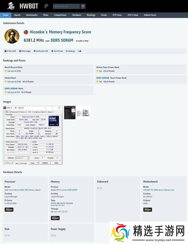 此次超频挑战中,Hicookie沿用了上次打破纪录时的强大配置,包括技嘉Z890 AORUS Tachyon ICE主板和英特尔Ultra 9 285K处理器。为了确保内存能够在极端条件下稳定运行,他再次采用了液氮冷却技术,这一技术对于降低温度、提升性能至关重要。
