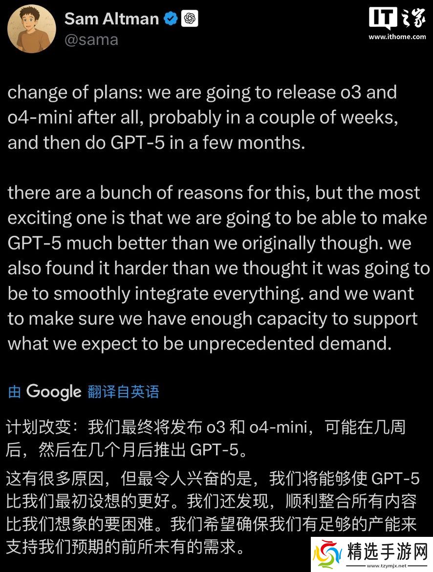 本站 4 月 4 日消息,OpenAI CEO 奥尔特曼今晚在社交平台 X 上发文称,可能在数周内发布 o3 和 o4-mini,未来几月内发布 GPT-5。