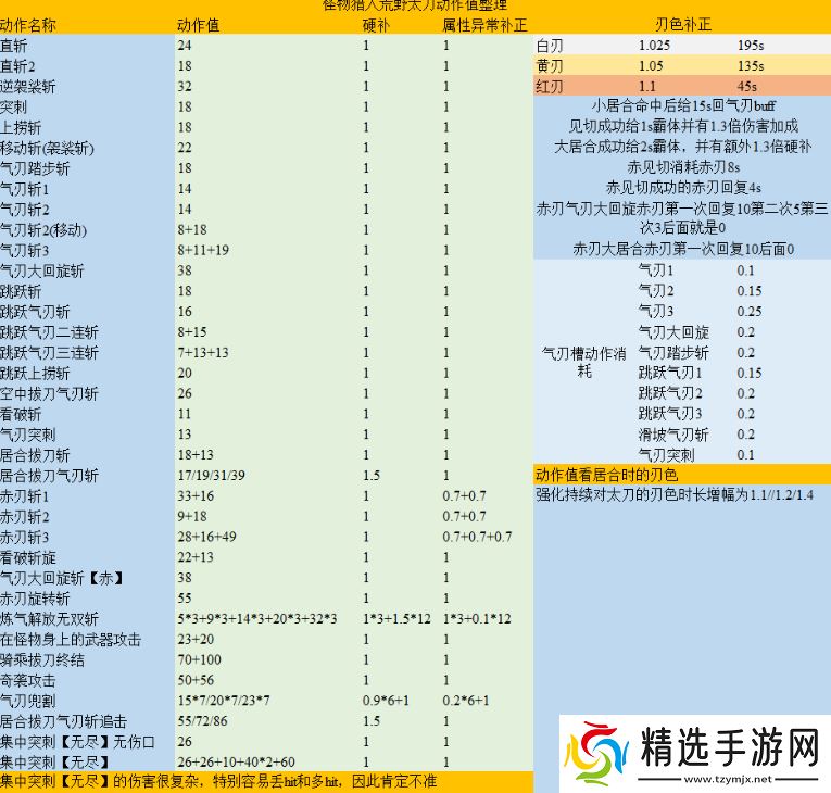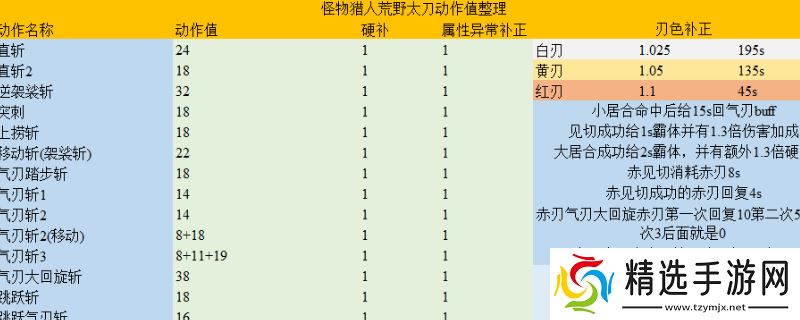 在本作中,太刀的强度依然无可挑剔,堪称完美。以下是笔者从游戏文件中解包出的太刀相关数据,供各位猎人参考: