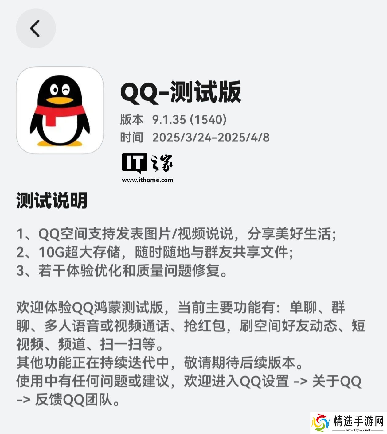 本站 3 月 25 日消息,除微信外,QQ 鸿蒙版 App 昨日也在华为应用市场(App Gallery)开启了 9.1.35(1540)测试版升级,测试时间为 2025/3/24- 2025/4/8。