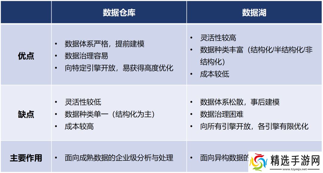数据仓库的特点是,先做数据处理,搞得规范整齐之后,存起来。用的时候就直接用。它主要存的是结构化(行列)数据。