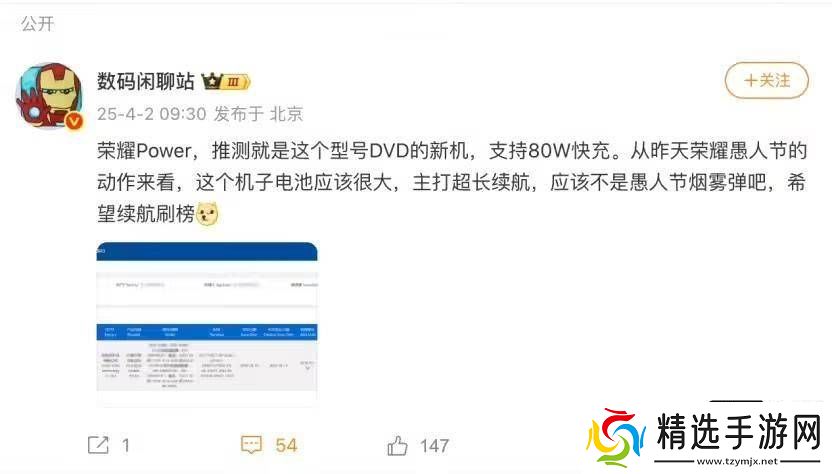 在荣耀Power正式公布之前,网络上已流传着不少关于该机的信息。知名数码博主@数码闲聊站曾透露,荣耀Power或将对应入网型号为“DVD”,并具备高达80W的快速充电能力,这一配置无疑为手机续航提供了强有力的保障。