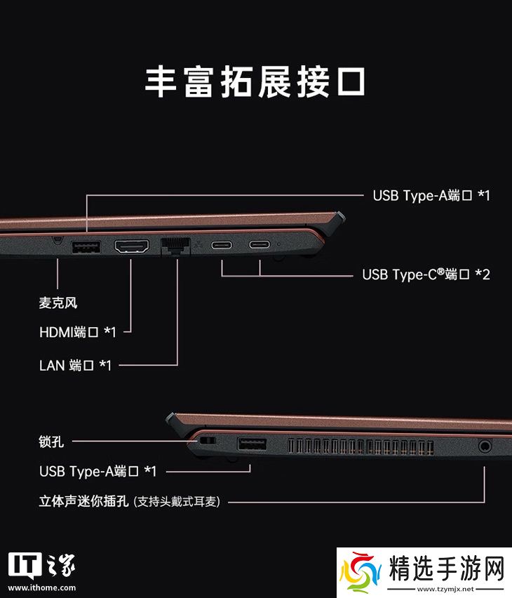 I/O方面,该机左侧配备1个 USB-A 接口、1个 3.5mm 音频接口;右侧配别1个 USB-A接口、1个 HDMI接口、1个 RJ45网口、2个 USB-C接口。