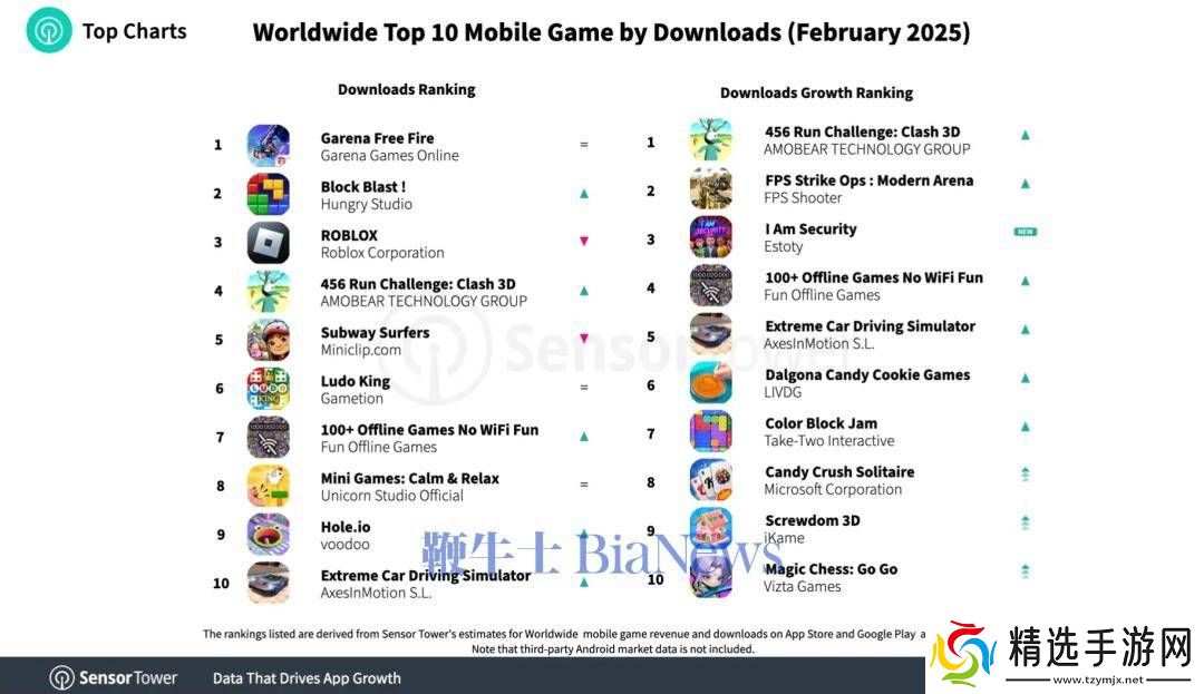 而在全球手游下载榜单方面,则呈现出另一番景象。《Free Fire》这款游戏凭借其独特的魅力和广泛的玩家基础,继续领跑全球手游下载榜。紧随其后的是《Block Blast!》,这款游戏以其创新的玩法和精美的画面赢得了众多玩家的喜爱。《Roblox》、《456 Run Challenge: Clash 3D》以及《Subway Surfers》也分别位列下载榜的前五名。