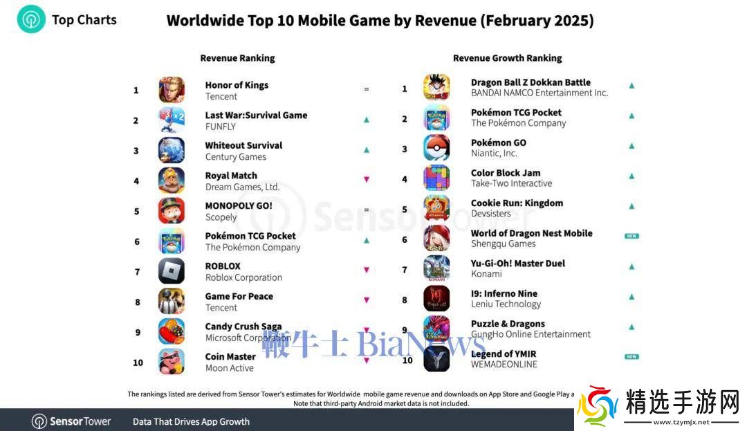 近期,全球手游市场的数据揭示了最新的竞争格局。据Sensor Tower发布的深入分析报告,腾讯的热门游戏《王者荣耀》在2025年2月再次证明了其无与伦比的吸金能力,蝉联全球手游收入榜冠军宝座。与此同时,一款名为《Last War: Survival》的游戏异军突起,成功跻身至榜单第二位,紧随其后的是《Whiteout Survival》、《Royal Match》以及《MONOPOLY GO!》,这三款游戏也成功挤入前五名。