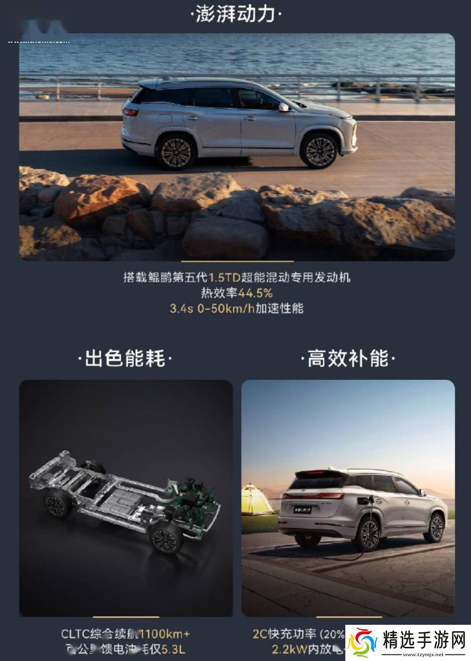 动力方面,捷途山海L9搭载了鲲鹏第五代1.5TD超能混动专用发动机,热效率高达44.5%。这款发动机赋予了车辆出色的加速性能,0-50km/h加速仅需3.4秒。同时,车辆的CLTC综合续航里程超过了1100km,百公里馈电油耗仅为5.3L。车辆还支持2C快充功率,从20%充至80%仅需约25分钟,并配备了2.2kW内放电和6.6kW外放电功能。