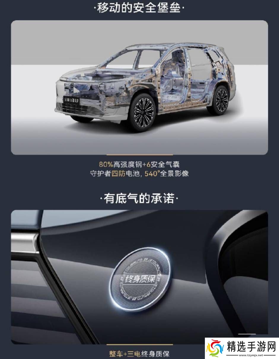 在安全方面,捷途山海L9的高强度钢占比达到了80%,并配备了6个安全气囊。车辆内置了守护者四防电池,并支持540°全景影像功能。官方还为消费者提供了整车+三电终身质保服务。在隔音方面,车辆的前排和前挡都配备了隔音玻璃,而后排则采用了28%透光率的隐私玻璃。