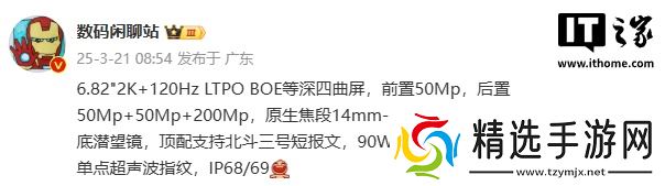 本站注意到,博主@数码闲聊站 此前曝光某厂 6.82 英寸等深四曲屏新机的部分参数,预计为 vivo X200 Ultra 手机,暂定 4 月中下旬发布。