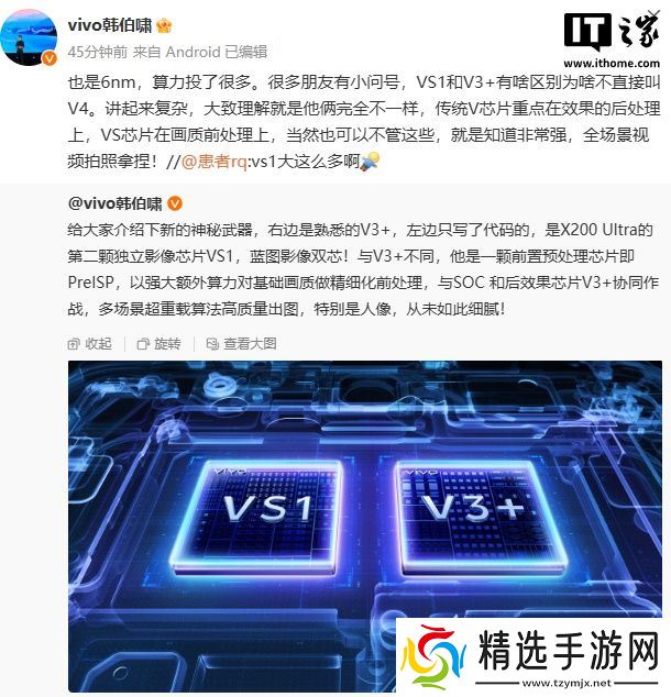 本站 3 月 26 日消息,vivo 通信科技有限公司产品经理韩伯啸今日发文透露,vivo X200 Ultra 手机将搭载第二颗独立影像芯片 VS1,支持蓝图影像双芯。