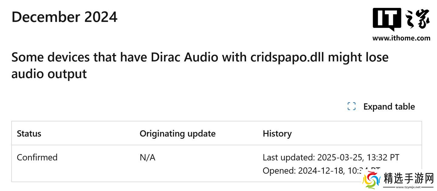 本站曾于 2024 年 12 月报道,微软承认在使用 Dirac Audio 和 cridspapo.dll 文件的电脑上,会导致系统无法向内置扬声器、蓝牙扬声器、耳机和其他音频设备输出声音,因此施加了系统兼容性更新屏蔽。