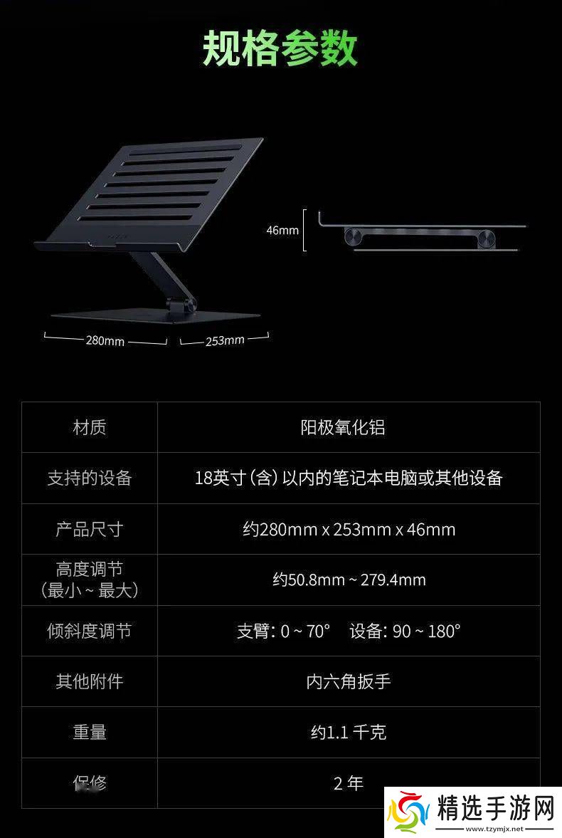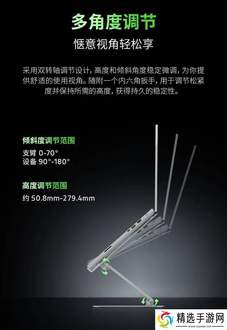 雷蛇这款支架的另一大亮点在于其高度的可调节性。用户可以根据自身需求,在50.8毫米至279.4毫米的范围内自由调节支架高度,无论是站立办公还是坐着使用,都能找到最适合自己的角度。同时,支架还支持折叠收纳,方便用户在不使用时进行携带或存放。