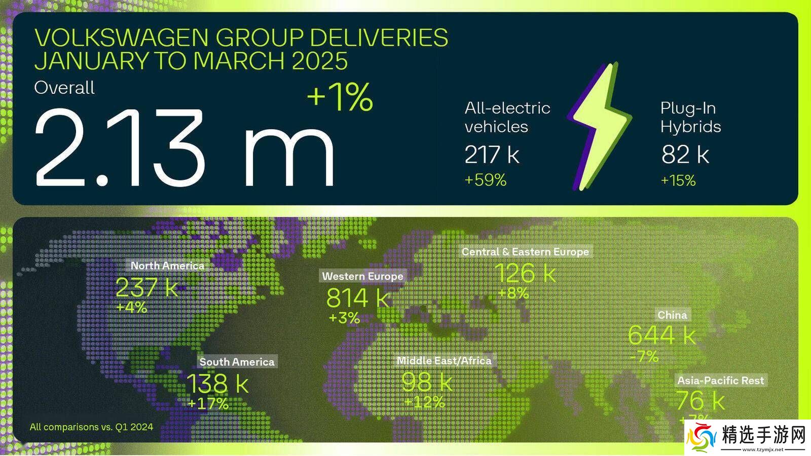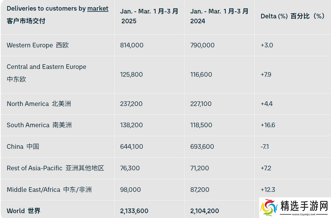 在全球各大市场中,中国市场一季度的表现略显疲软,交付量达到64.41万辆,但与去年同期相比,下降了7.1%。然而,大众集团在其他地区的表现则较为亮眼,北美市场增长了4%,南美市场更是实现了17%的大幅增长。同时,西欧市场和中欧及东欧市场也分别取得了3%和8%的增长。