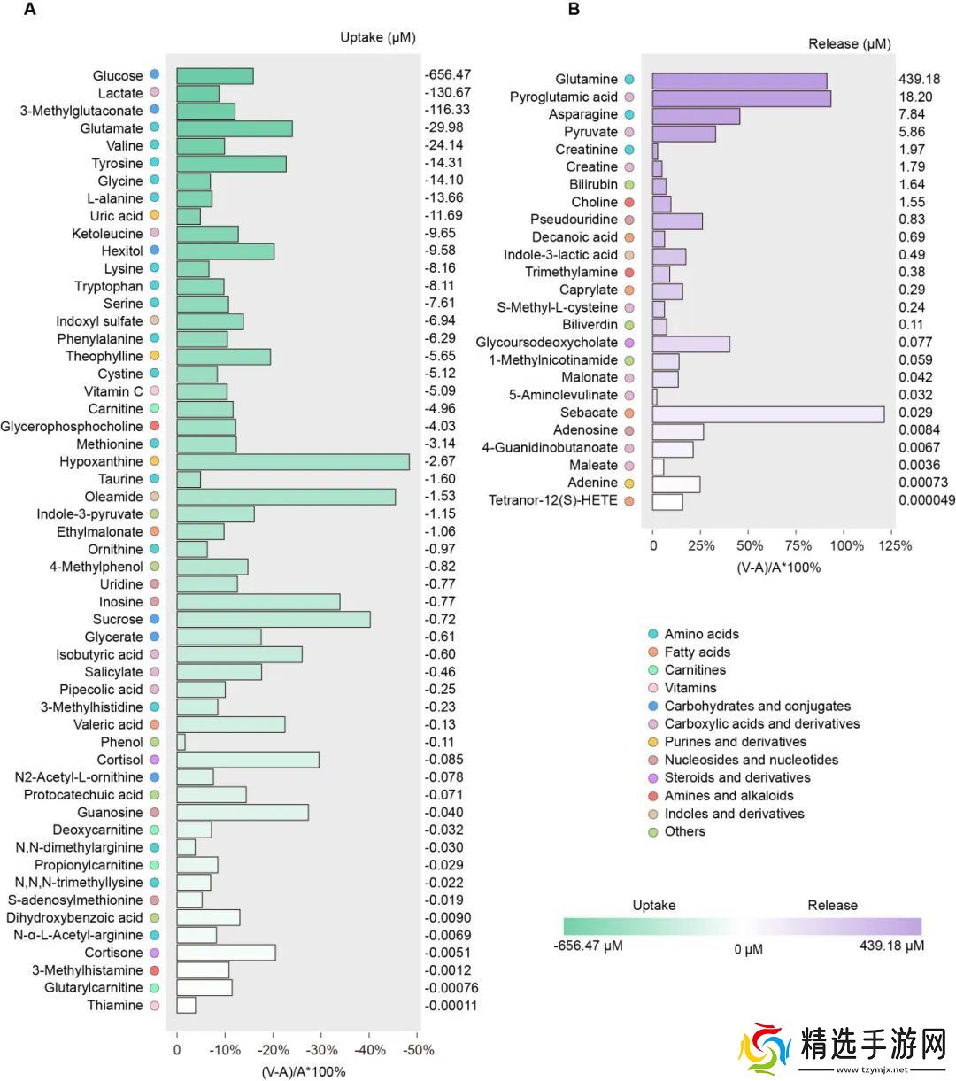 在人脑动静脉代谢组数据中,研究团队发现,大脑对葡萄糖的净摄取绝对量最高(656.47 μM),次黄嘌呤(hypoxanthine)为净吸收率最高的代谢物,动脉中 48.4% 被大脑摄取。