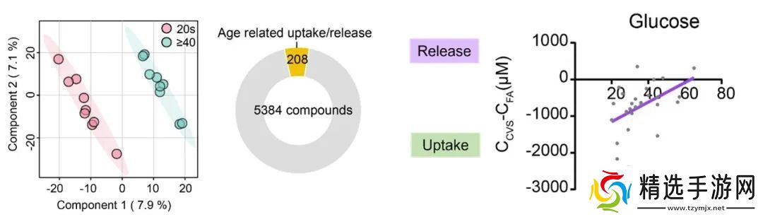 研究者进一步探讨了年龄对人脑代谢的影响,分析了年龄与脑部代谢物摄取和释放的相关性,鉴定出 8 种代谢物和 15 种脂质的血脑交换特性与年龄相关。随着年龄增长,大脑对葡萄糖的摄取减少,反映出大脑代谢活性的降低。大脑对 TAG 48:3 (18:1) 的消耗随年龄增长而增加,大脑释放的天冬酰胺(asparagine)、胆绿素(biliverdin)和溶血磷脂酰胆碱(LPC)随年龄增长而增加。