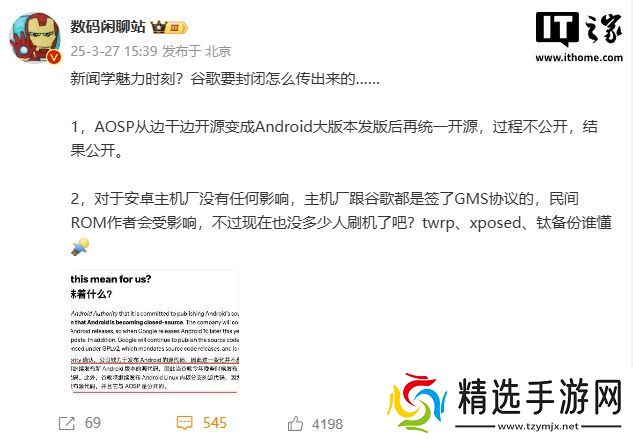 除此之外,也有大量业内人士对于所谓的“闭源”进行了解释,称谷歌“闭门开发”并不意味着安卓变成闭源系统,因此并不会对 OEM 厂商造成影响。此举可能会对部分个人开发者产生影响,同时也不方便媒体从公开代码中挖掘安卓新功能。