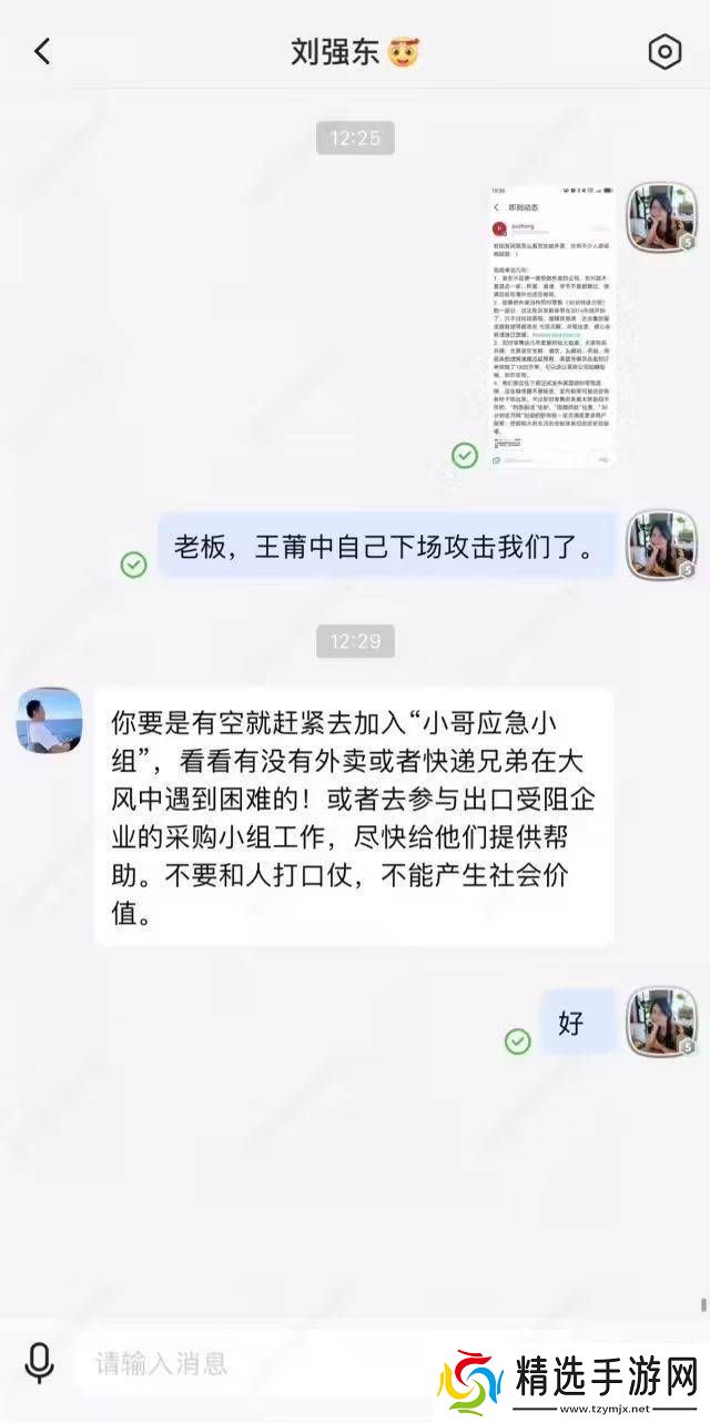 截图内容揭示,刘强东对当日早些时候美团核心本地商业CEO王莆中的言论作出了直接回应。王莆中此前曾公开质疑京东进军外卖市场的决定,提及阿里巴巴、滴滴、字节跳动等公司也曾尝试却未获显著成功。面对这样的质疑,刘强东显得颇为务实,他建议有空的人员加入“小哥应急小组”,实地帮助在大风中遇到困难的外卖或快递小哥,或者参与出口受阻企业的采购小组,为这些企业提供实际帮助。