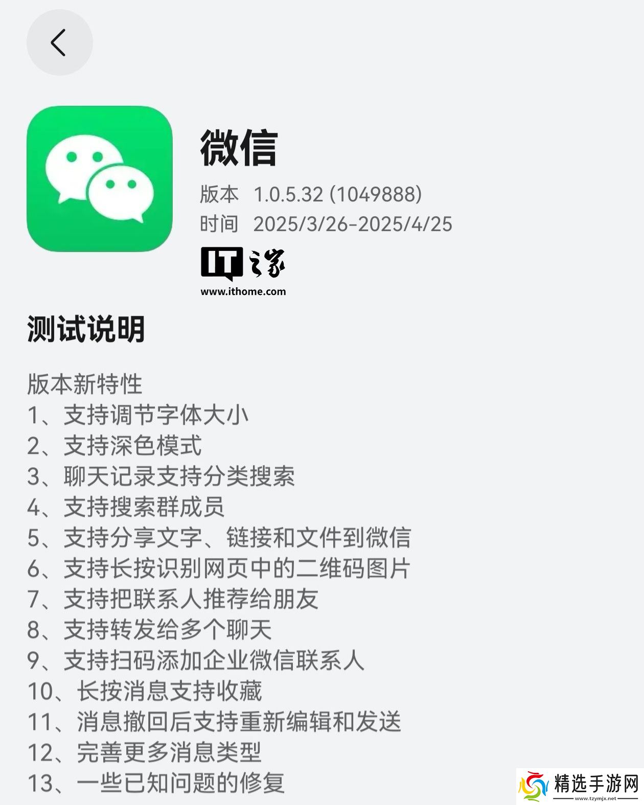 本站 3 月 27 日消息,微信鸿蒙版 App 昨日晚在华为应用市场(App Gallery)开启 1.0.5.32(1049888)版本邀测升级(需收到短信通知后点击链接跳转安装,未收到短信需继续等待),测试时间为 2025/3/26 - 2025/4/25。