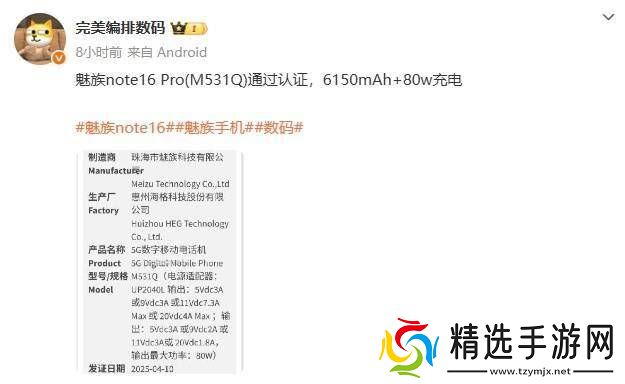 近日,一款型号为M531Q的魅族新机悄然通过了3C认证,引发了广泛关注。据知名数码博主@完美编排数码透露,这款新机实为魅族Note 16 Pro,其在续航与充电方面表现出色,配备了高达6150mAh的大容量电池,并支持80W快充技术。