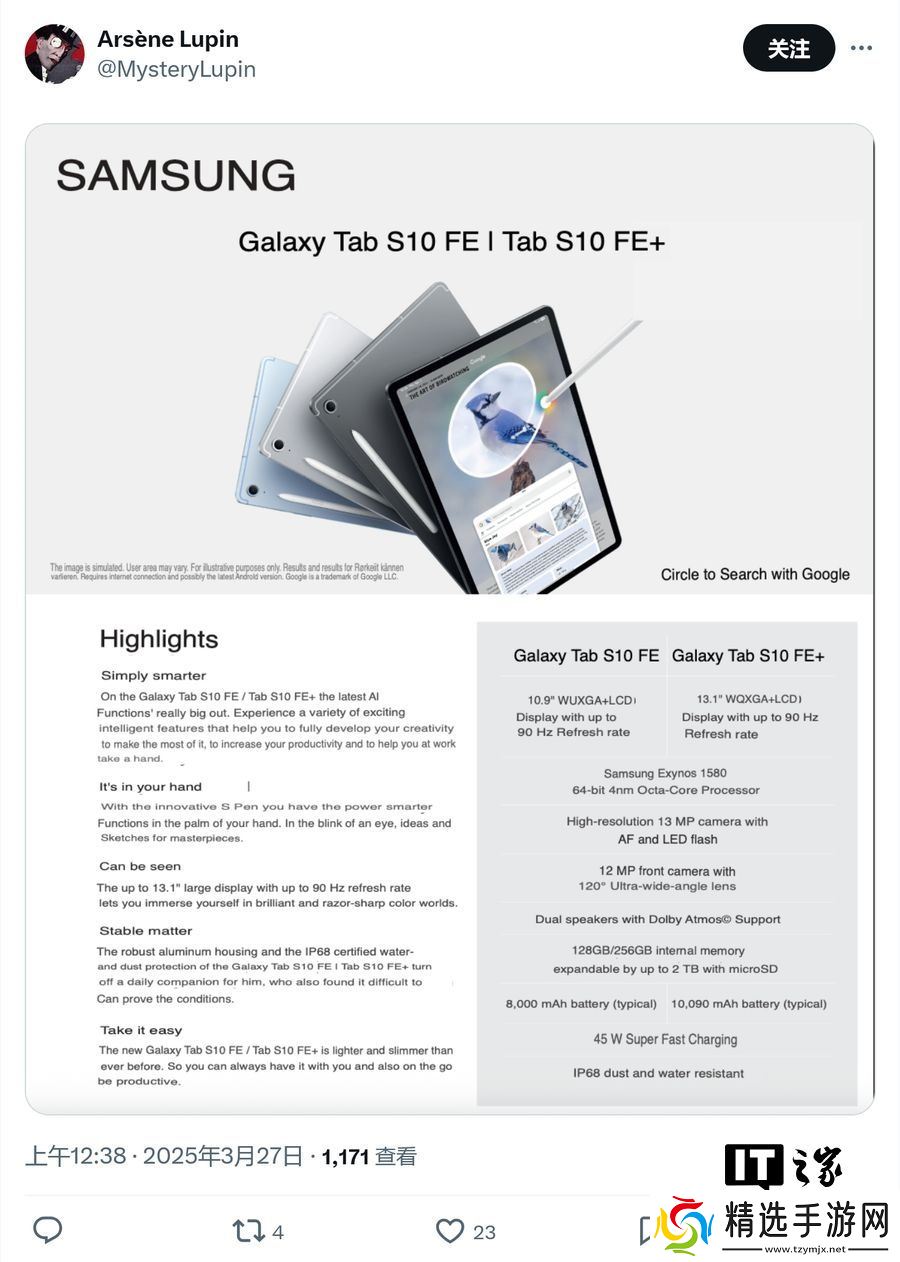 本站 3 月 28 日消息,消息源 @MysteryLupin 昨日(3 月 27 日)在 X 平台发布推文,分享了三星 Galaxy Tab S10 FE 和 Galaxy Tab S10 FE+ 两款平板的完整规格、欧洲定价及高清渲染图。