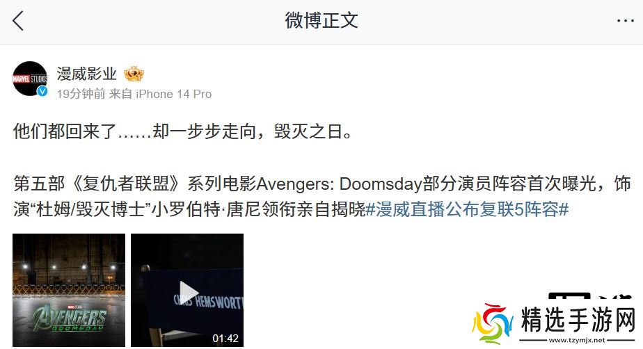 本站 3 月 27 日消息,漫威影业昨日晚官宣超英电影《复仇者联盟 5》开拍,并直播 5 小时公布该片部分演员阵容。值得一提的是,此前官宣回归漫威 MCU 并将饰演反派“毁灭博士”的小罗伯特・唐尼最后压轴登场。