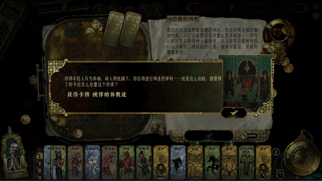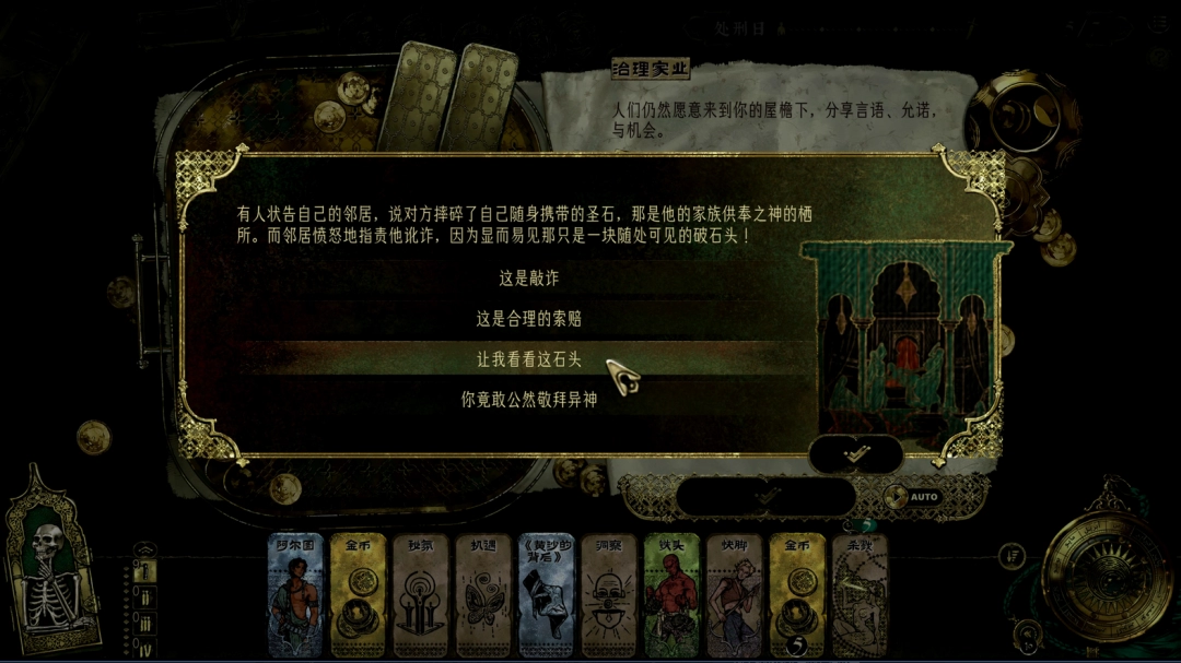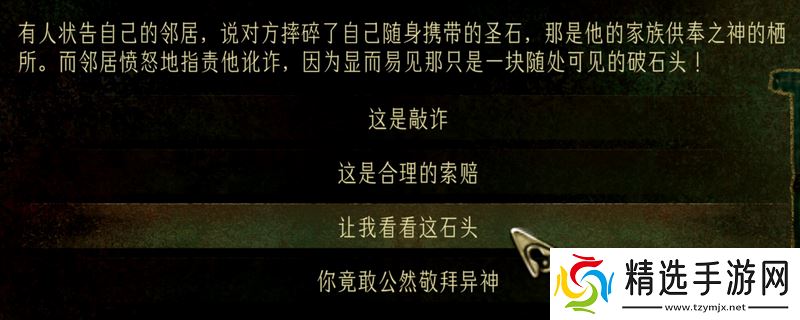 《苏丹的游戏》中新的一天会遇到的突发事件是非常多的,不同事件的选择效果也不一样,首先是邻居的圣石,有人状告自己的邻居,说对方摔碎了自己随身携带的圣石,那是他的家族供奉之神的栖所。而邻居愤怒地指责他讹诈,因为显而易见那只是一块随处可见的破石头!