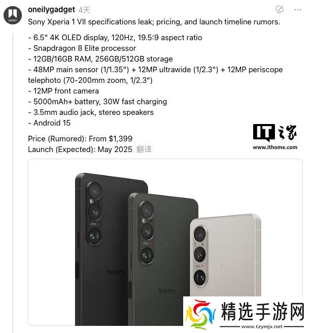 根据 Oneilygadget 的爆料,索尼 Xperia 1 VII的配置如下: