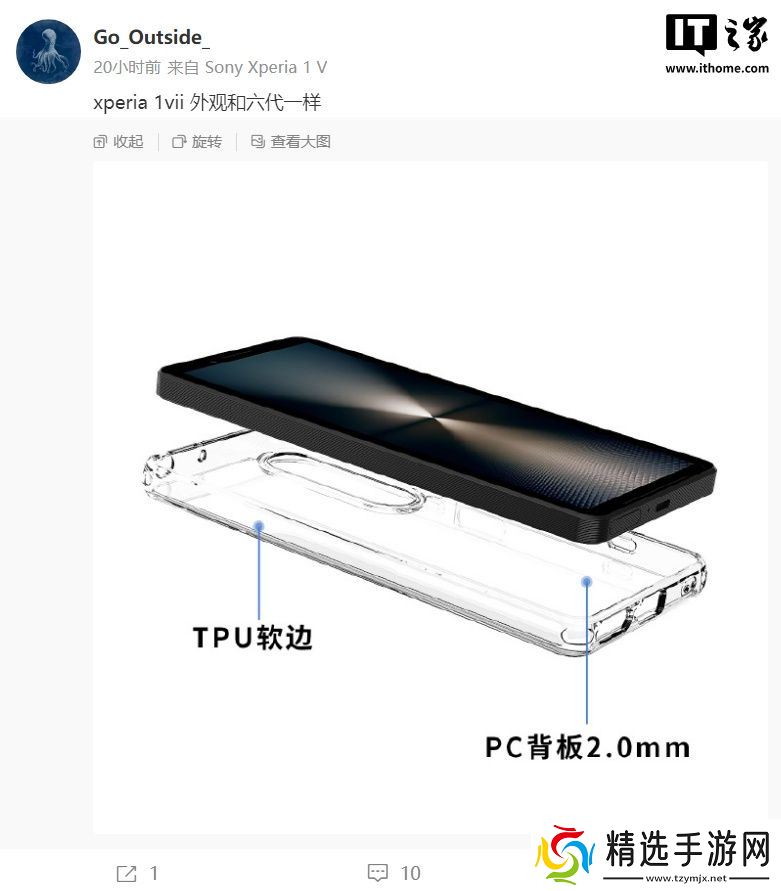 微博用户 Go_Outside_ 昨天也发布了一张号称是 Xperia 1 VII 的手机壳图,并配文表示“Xperia 1 VII 外观和六代一样”。(图中其壁纸与 Xperia 1 VI 的官方默认壁纸完全相同,但索尼历来会在迭代机型中更新默认壁纸。)