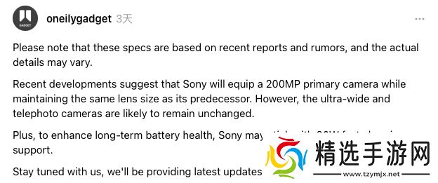 后续 Oneilygadget 称,他的发文基于最近的报道和预测,实际规格可能有所不同;他还表示,索尼也有可能将主摄升级为 2 亿像素,但镜头尺寸与上一代相同,但超广角和长焦规格可能保持不变,在快充功率方面,索尼为长期的电池健康考虑,可能持续使用 30W 的快充规格。