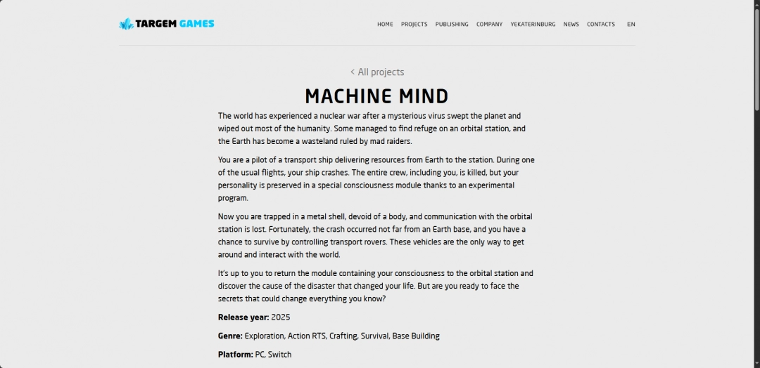 《Machine Mind》是一款末日题材的动作游戏,而这款游戏的官网地址就是一个官网页面,另外Steam平台的购买页面也算官网,进入到这个游戏的购买页面基本上就能知道所有这款游戏的信息。