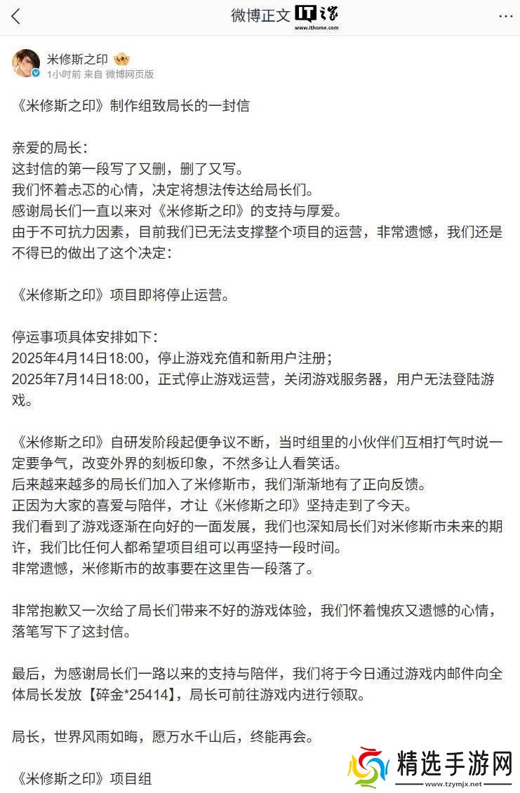 根据官方发布的通知,这一决定源于不可抗力因素,使得项目团队无法继续支撑其运营。因此,他们怀着沉重的心情,做出了停止《米修斯之印》运营的决定。具体安排为,自今日18时起,游戏将停止充值服务及新用户注册;而到了今年7月14日18时,游戏将正式关闭服务器,届时玩家将无法再登录游戏。