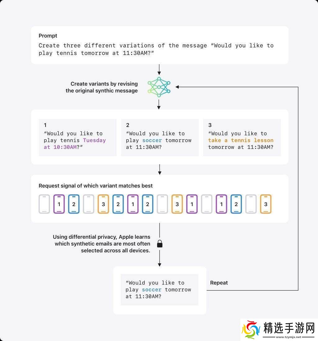 面对长文本处理的挑战,如邮件摘要功能,苹果开发了一套独特的合成数据解决方案。他们首先利用大型语言模型生成大量虚拟邮件,并将其转换为包含主题和语言特征的数字向量。随后,参与计划的设备会在本地计算真实邮件的向量,并通过差分隐私技术匿名反馈与合成向量最为接近的类型。经过多次迭代,系统能够构建出一个反映真实邮件分布规律的合成数据集,而无需接触任何原始邮件内容。这一技术已在邮件摘要功能的测试版中得到了验证,并计划未来应用于写作助手等其他场景。