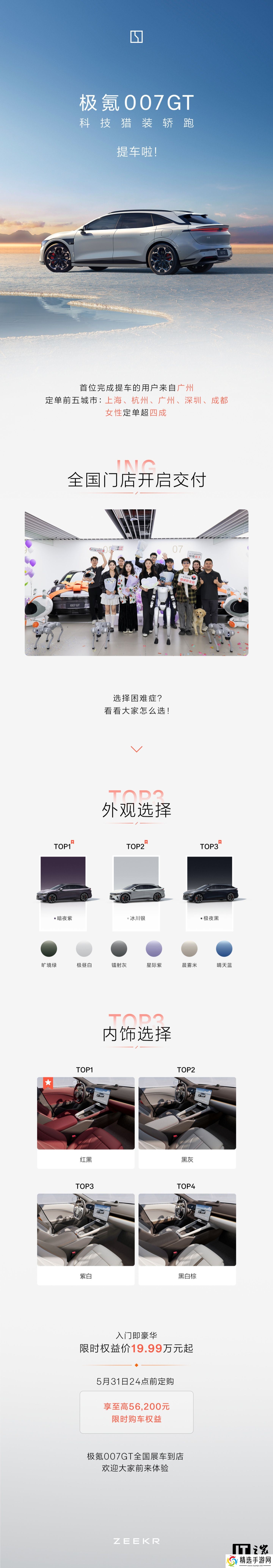 极氪官方今日宣布,极氪 007GT 纯电猎装车开启全国交付,其中女性车主占四成,暗夜紫、红黑内饰最受欢迎。