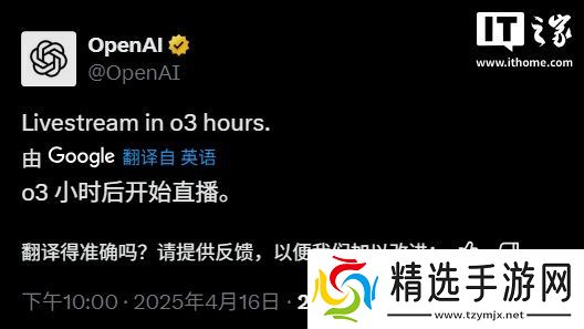 本站 4 月 16 日消息,OpenAI 今日晚间 10 点发布预告,将在o3 小时后进行直播。从官方特别用词来看,预计将发布满血版 o3 推理模型,时间为凌晨 1 点。