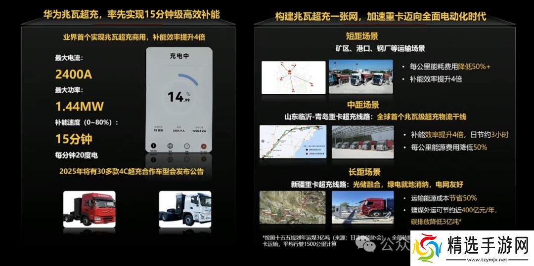 针对该问题,华为发布了商用的兆瓦超充技术,最大电流可达 2400A,最大功率 1.44MW,3 秒钟可补 1 度电,覆盖短、中、长途等不同场景。
