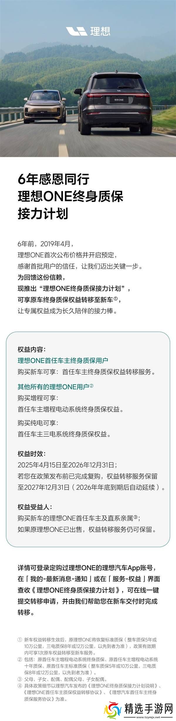为了表达对这一群体深厚情感的认可,理想汽车正式推出了“6年感恩同行|理想ONE终身质保「接力计划」”。这一计划旨在增强车主对理想汽车产品质量的信心,并为首批理想ONE车主在换车时面临的质保问题提供解决方案。